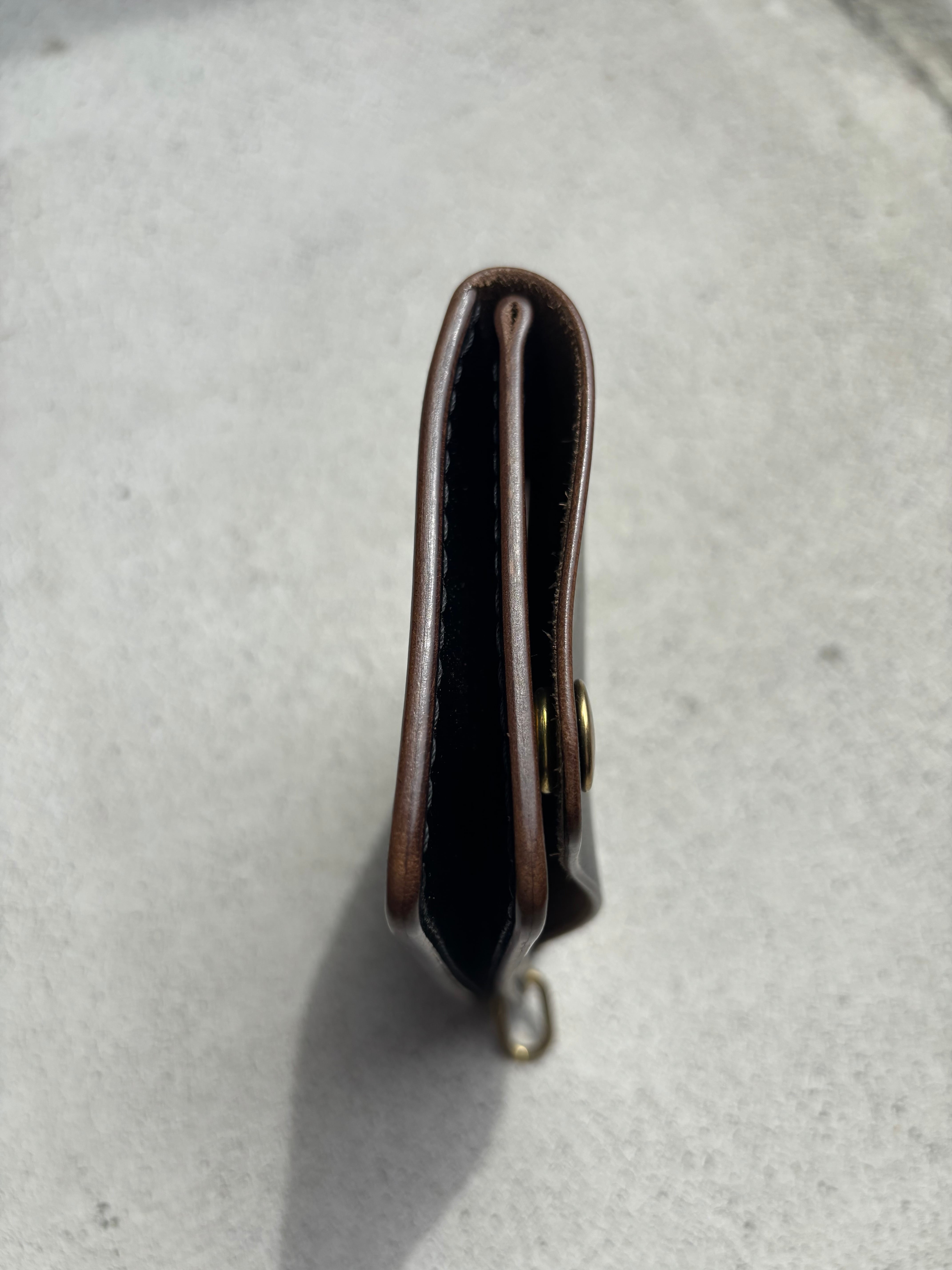 馬の「BUTT / バット」と呼ばれる線維密度の高い臀部(尻部分)を植物タンニンで鞣し、茶系の色で下地染色をした後、表面を黒の顔料で塗装した茶芯レザーになります。